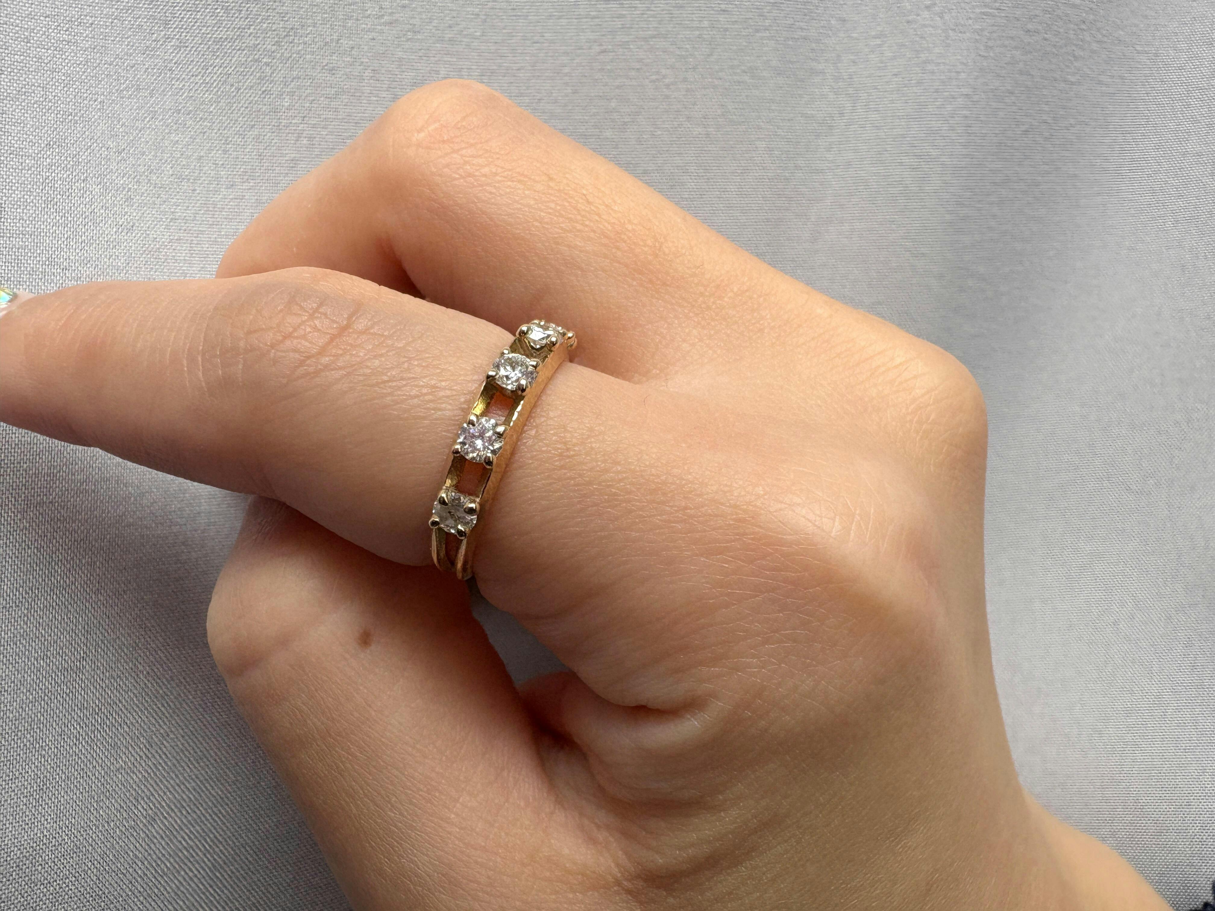間隔の空いた5粒のダイヤモンドが、エッジの効いたシャープなフォルムの2本の地金に挟まれ、抜け感がありつつも華やかで、時よりダイヤが宙に浮いているようにも感じさせます。見る角度・その日の気分によって表情を変えるハーフエタニティリング。