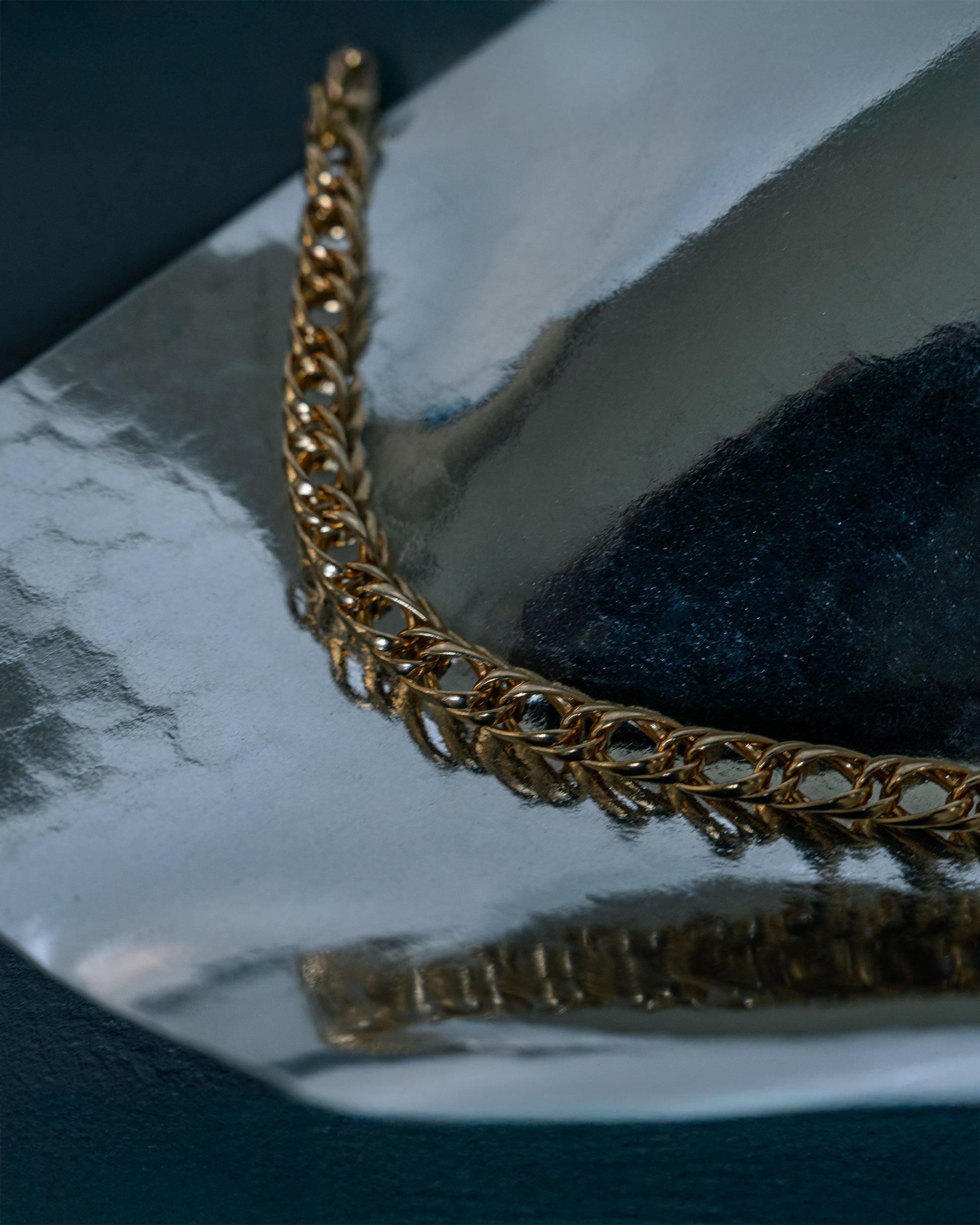 無骨さの中に、どこか品のある佇まいを備えた重厚なシルバーチェーンを使用。